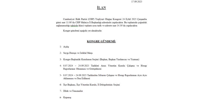 Cumhuriyet Halk Partisi (CHP) Yeşilyurt Olağan Kongresi 24 Eylül 2025 Çarşamba günü saat 11.00’da CHP Malatya İl Başkanlığı adresinde yapılacaktır. Bu toplantıda çoğunluk sağlanamadığı taktirde ikinci toplantı aynı tarih ve adreste saat 14.30’da yapılacaktır.